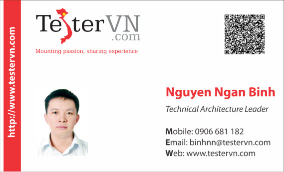 Technical Architecture Leader của diễn đàn TesterVN.com 2 năm kinh nghiệm phát triển phần mềm, 6 năm kinh nghiệm về Software Testing. Đoạt giải “BUG HUNTING CONTEST” do VISTACON tổ chức vào năm 2012. Tham gia cộng tác tổ chức và làm diễn giả các buổi seminar lớn như: Automation Testing, SMARTPHONE Testing, WE ARE TESTER 2013 – MOBILE AUTOMATION TESTING... Câu nói ưa thích: "Nói ít, làm nhiều thành công sẽ đến với niềm đam mê của bạn"